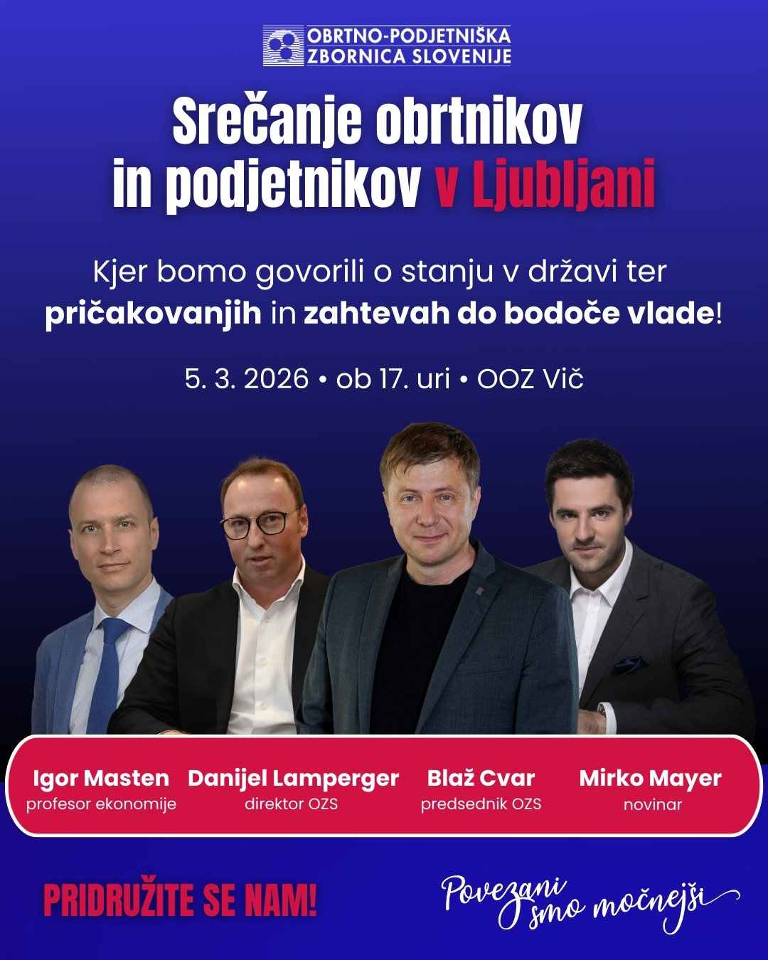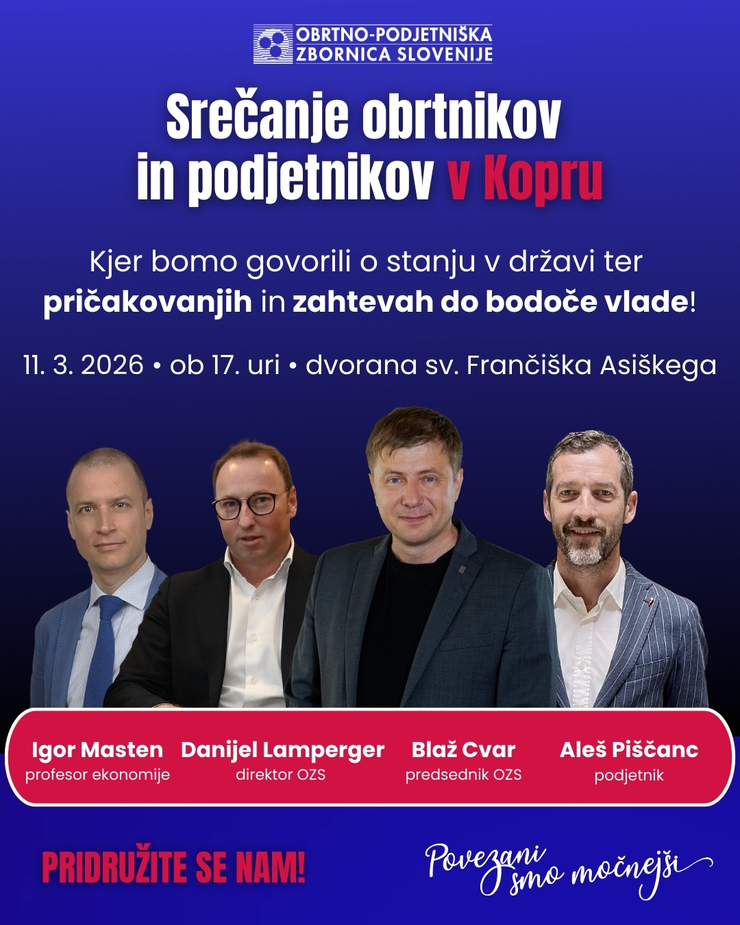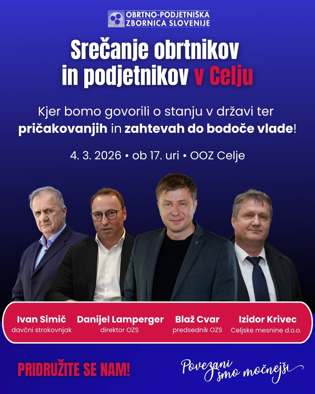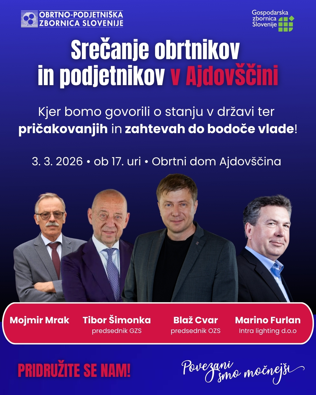 OZS v predvolilnem času izvaja serijo regijskih srečanj, kjer lahko obrtniki in podjetniki izrazijo svoje mnenje in pričakovanja do prihajajoče nove vlade. V novem krogu se bomo najprej srečali v Ajdovščini, Celju in Ljubljani, nato pa še v Novem mestu in Kopru. Srečanja so odprta za vse, ki želijo soustvarjati boljšo prihodnost slovenskega gospodarstva. Srečanja so odprta za vse, ki želijo soustvarjati boljšo prihodnost slovenskega gospodarstva. Vaša prisotnost je vaš glas, se vidimo v vaši regiji!