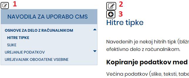Za urejanje priročnika imamo na voljo tri ikone. Ikona pod številki