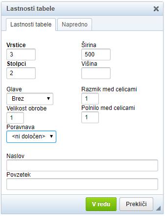 Tabelo med besedilo vstavite, tako da izberete sliko ''Tabela''. Pojavi se spodnji dialog: