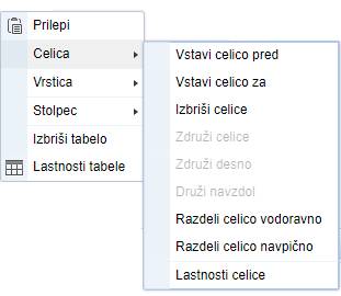 Če kliknete z desno tipko nad celico tabele se pojavi dodatni meni s katerim lahko urejate lastnosti posamezne celice, združite dve celici, vstavljate vrstice ali stolpce.